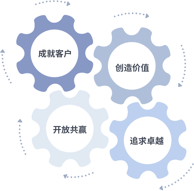 成就客户是一切决策的出发点,,创造价值是衡量所有工作的标准,,追求卓越是我们做事做人的态度,,,,开放共赢是我们的格局也是最终的结果。。。。价值观的齿轮环环相扣,,,推动着组织里的每个人不断向前。。。。